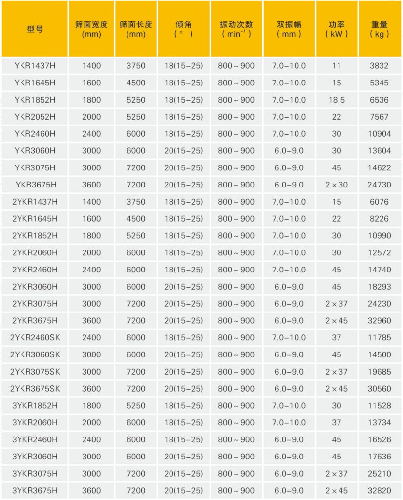 廣泛適用于石料、冶金、金屬礦山、煤炭等各類篩分工況;YKR-H系列一般入料粒度≤ 300mm,分級粒度2~150mm;YKRSK系列一般入料粒度≤250mm,分級粒度2~76mm;